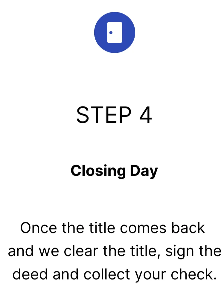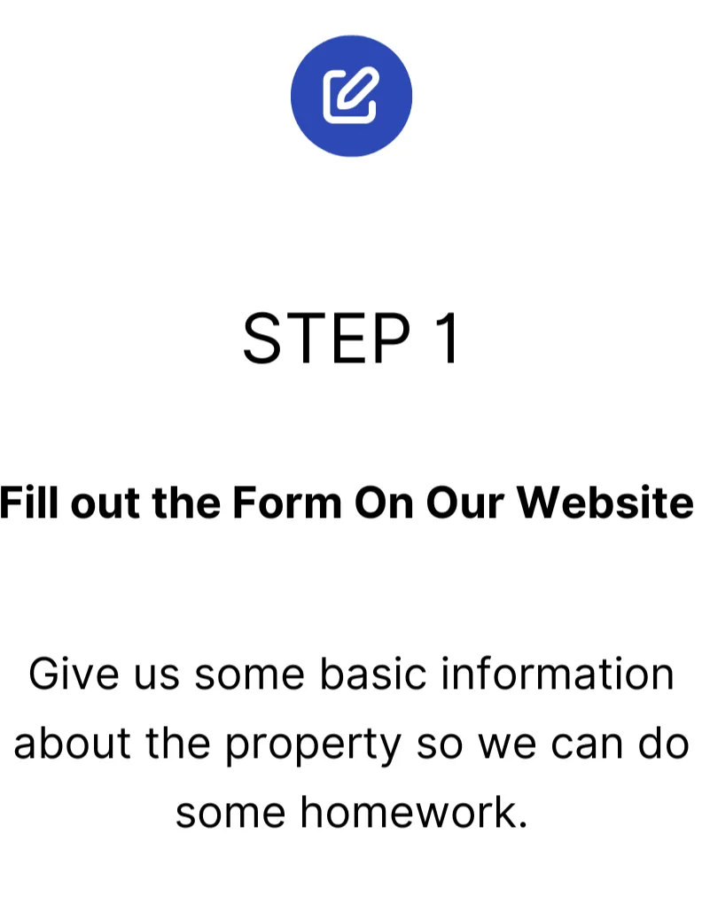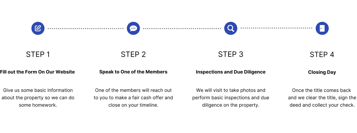 First fill out our form on our website or call . We'll have a brief conversation to gather information to make you an educated offer. If our offer is acceptable to you, we can then begin the process of working towards closing and getting your funds to you via bank wire or check.